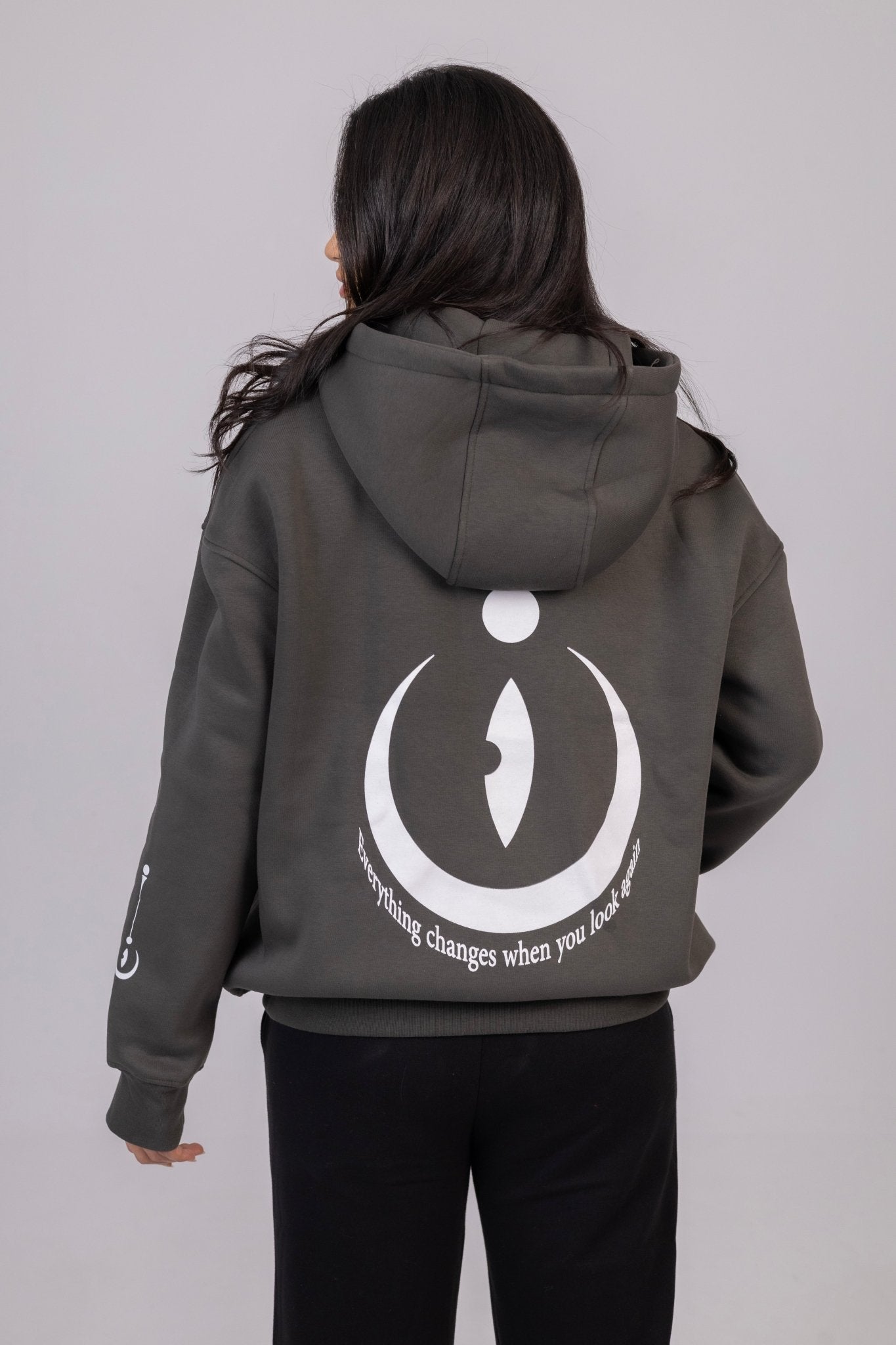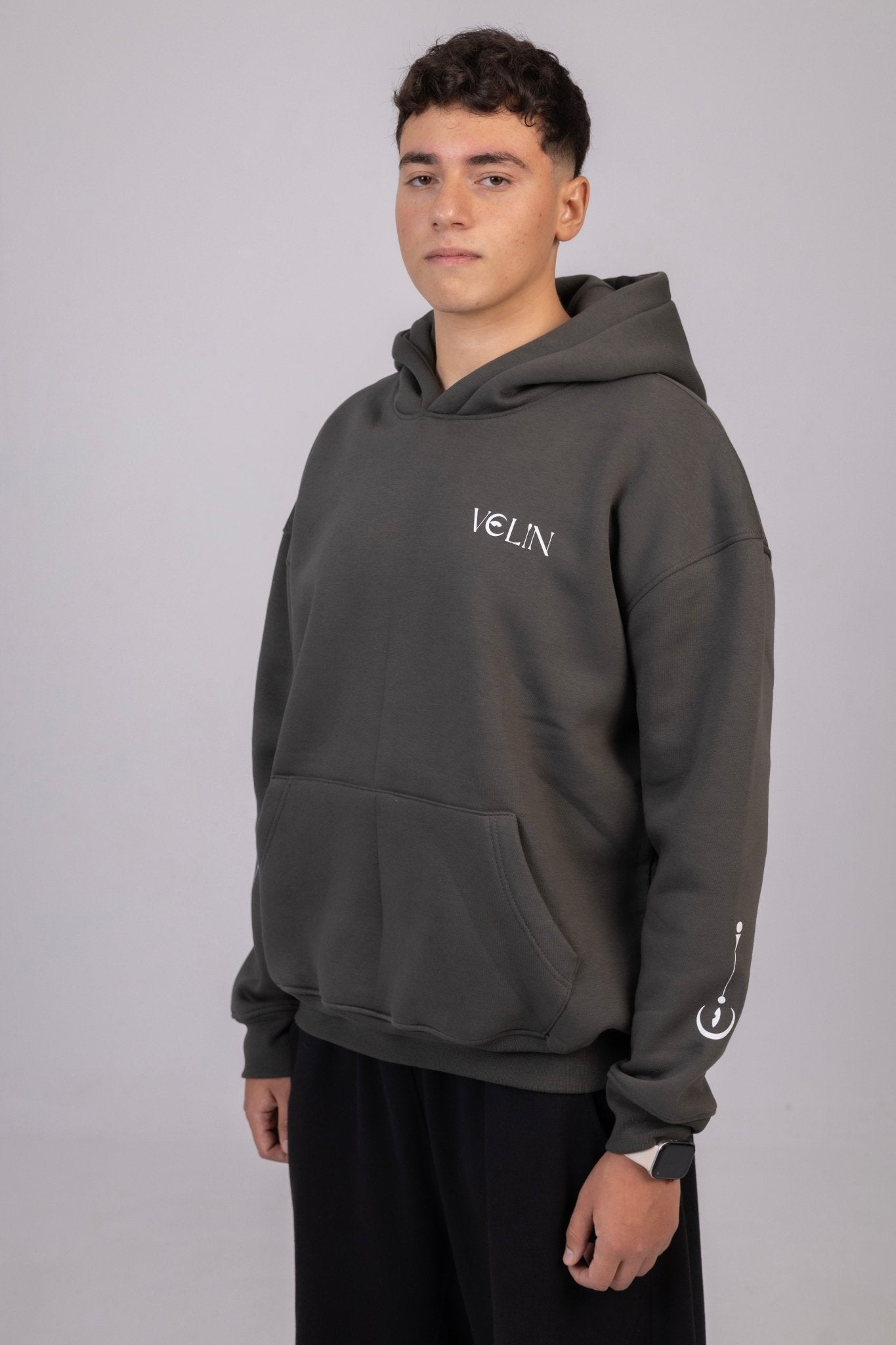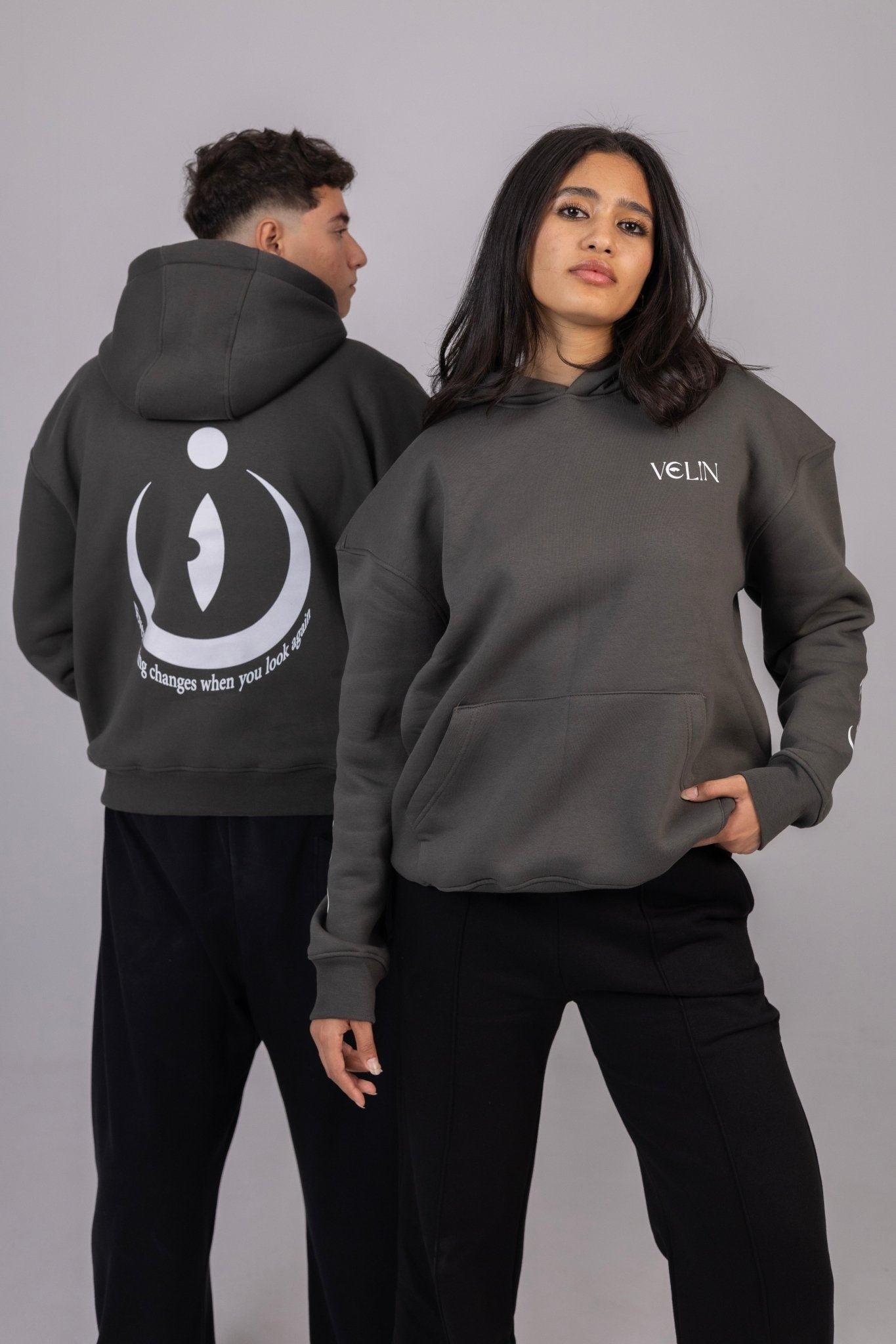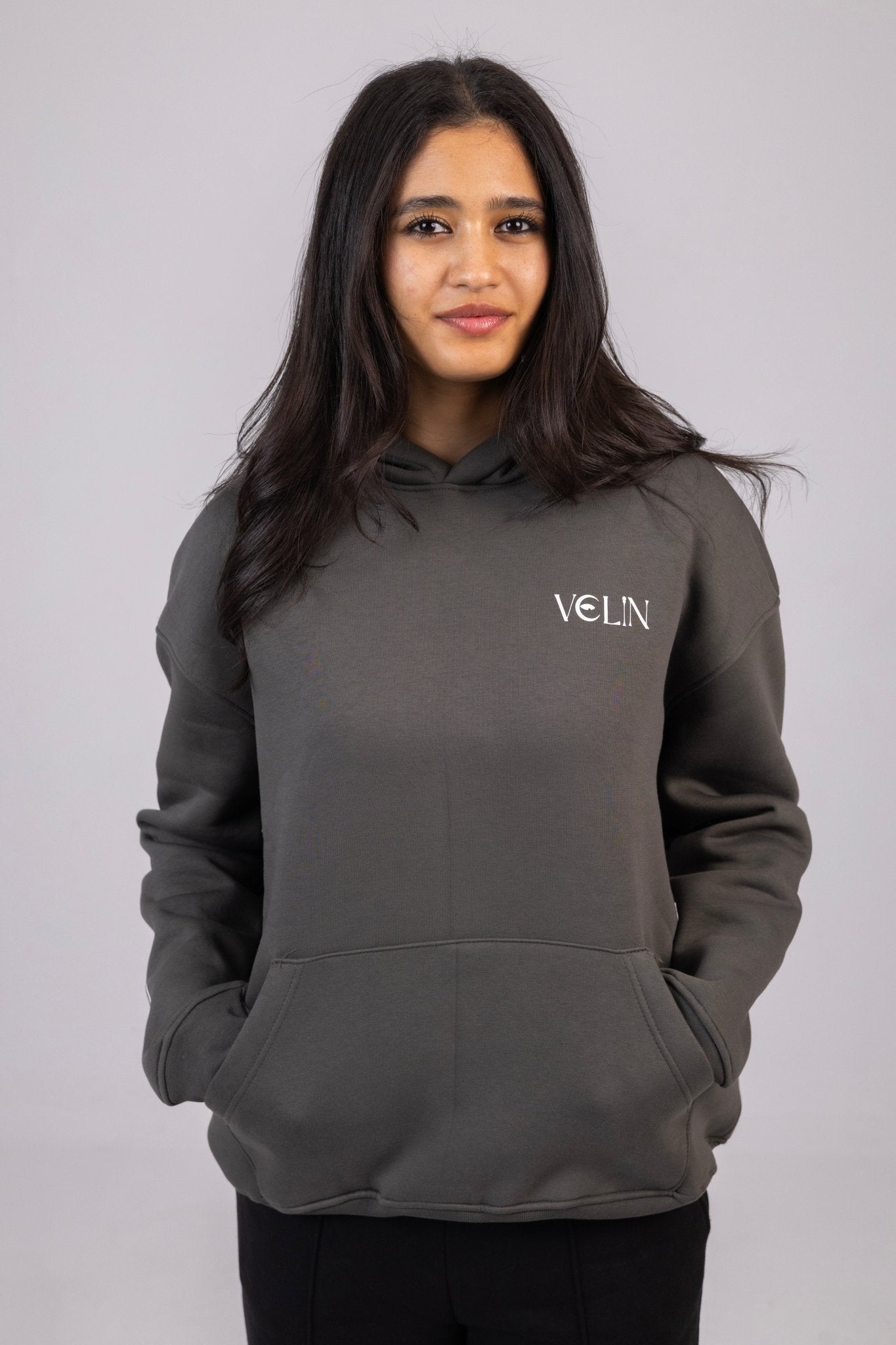 Step into bold minimalism with our unisex charcoal hoodie featuring the signature VELIN chest logo and an eye-catching oversized back graphic. Designed for those who see style as a statement, this piece blends comfort with meaning through its clean lines, deep tones, and inspiring printed message.